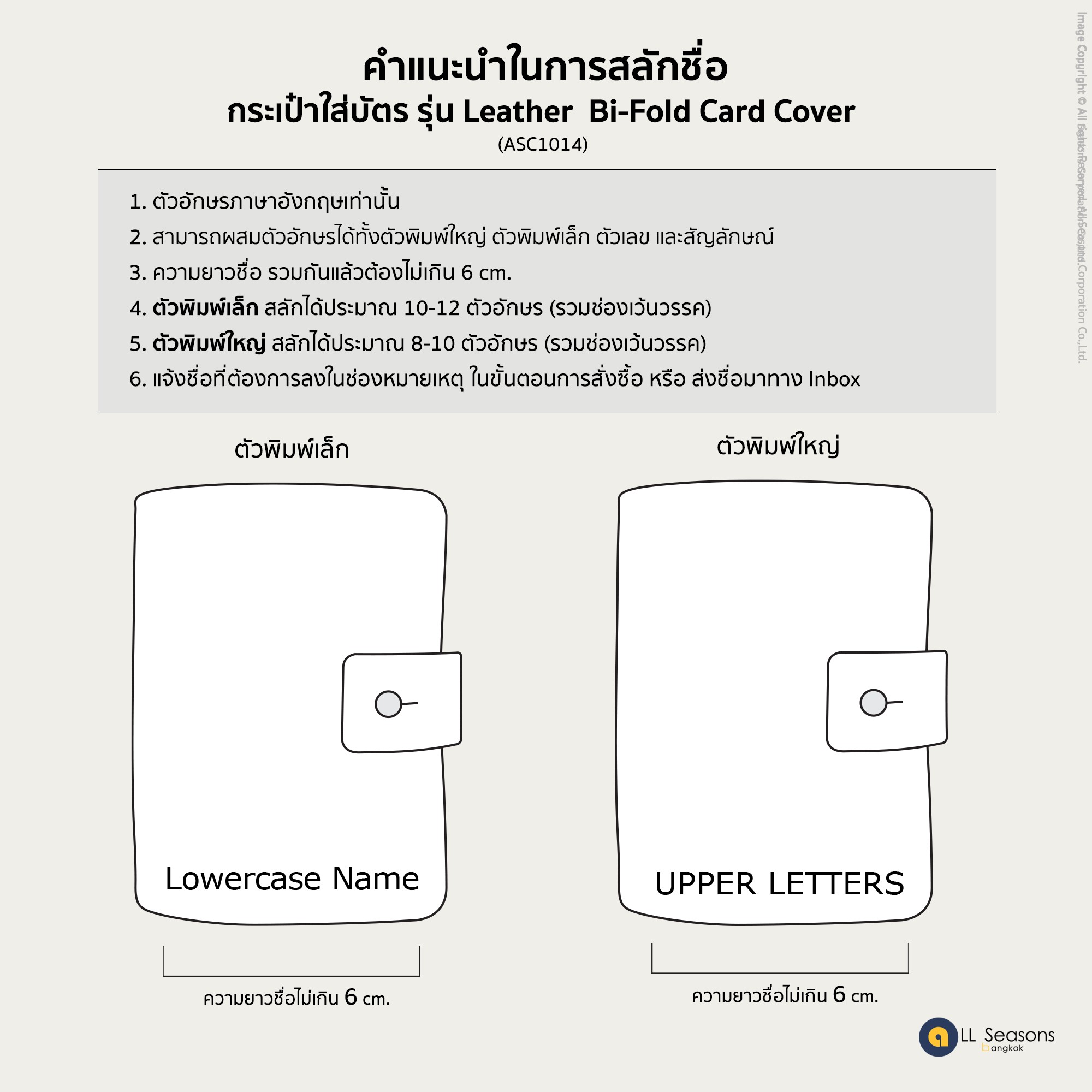 3. พยัญชนะซ้ำกันได้อักษรละ 2 ตัว / ส่วนสระ (a e i o u) ซ้ำกันได้อักษรละ 5 ตัว 4. ความยาวชื่อ รวมกันแล้วต้องไม่เกิน 6 cm.